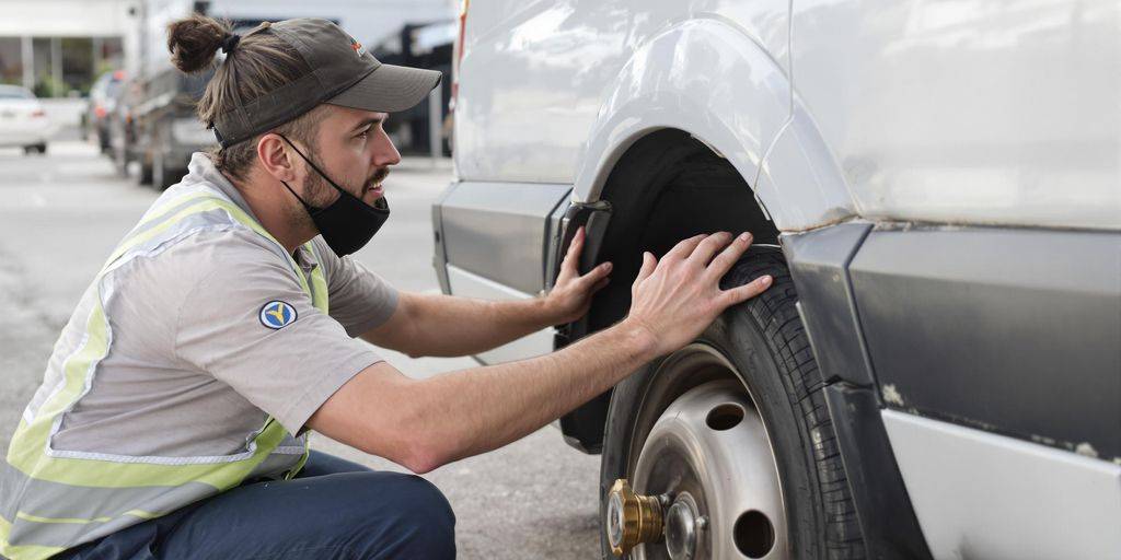 Driver inspecting a van's tires and lights.